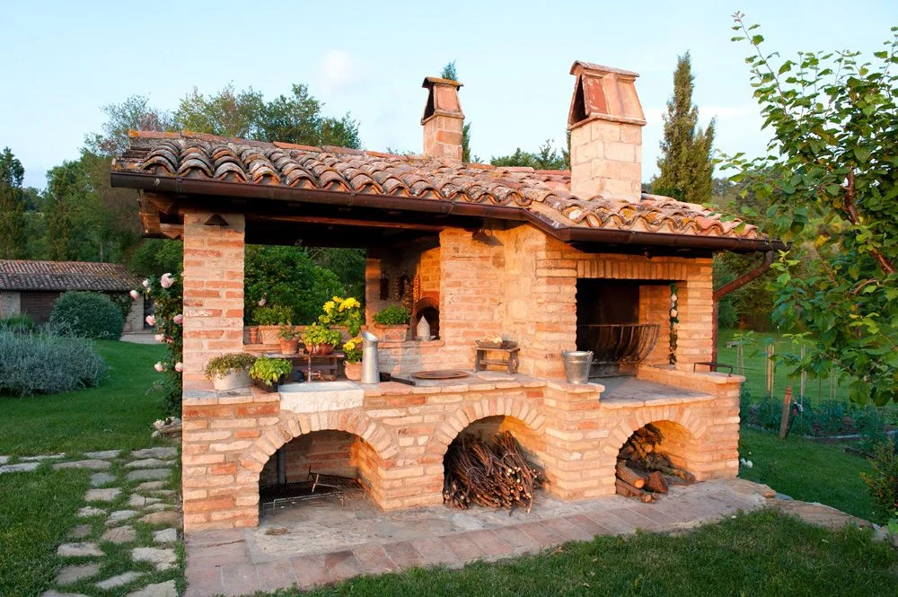 A wood-burning oven and grill is housed in a separate building at the front of the house. The wood burning grill attached to the structure offers a stone sink, plenty of work space and a large open grill.